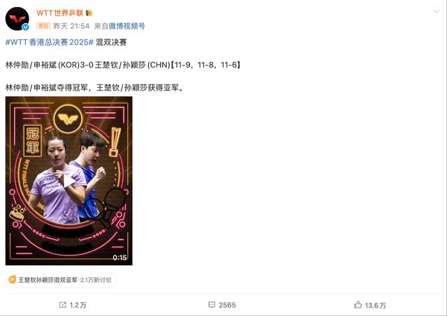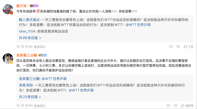 WTT官方庆祝林钟勋/申裕斌夺冠的推文下方,孙颖莎的粉丝们直接攻下了WTT的官推,无数的球迷对wtt的赛程放置/歹意给莎头混双外卡感应不满。