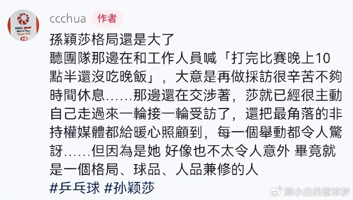 角逐竣事后,WTT官方工作人员流露国乒的随行人员说孙颖莎角逐打完10点半还没吃晚餐,大要意思是角逐完没吃饭又要接管采访太辛劳,国乒的随行人员正在跟采访组交涉,孙颖莎本身就走上前接管采访。